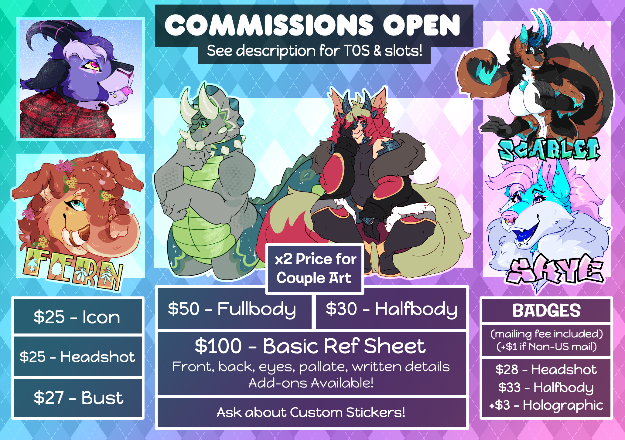 ABOUT: Sparkly, colorful merch and commissions! Click the image to get a closer look at commissions prices or click here to see more info.